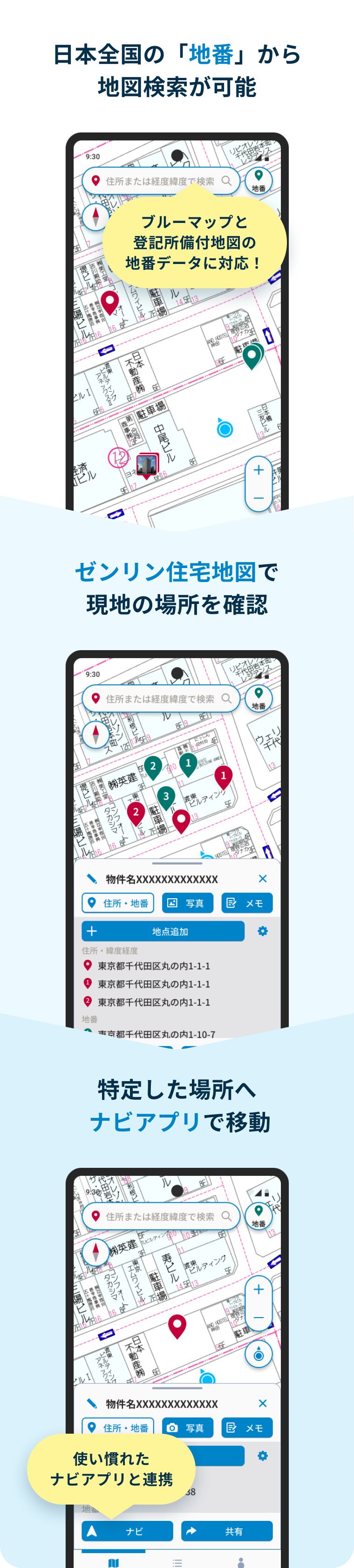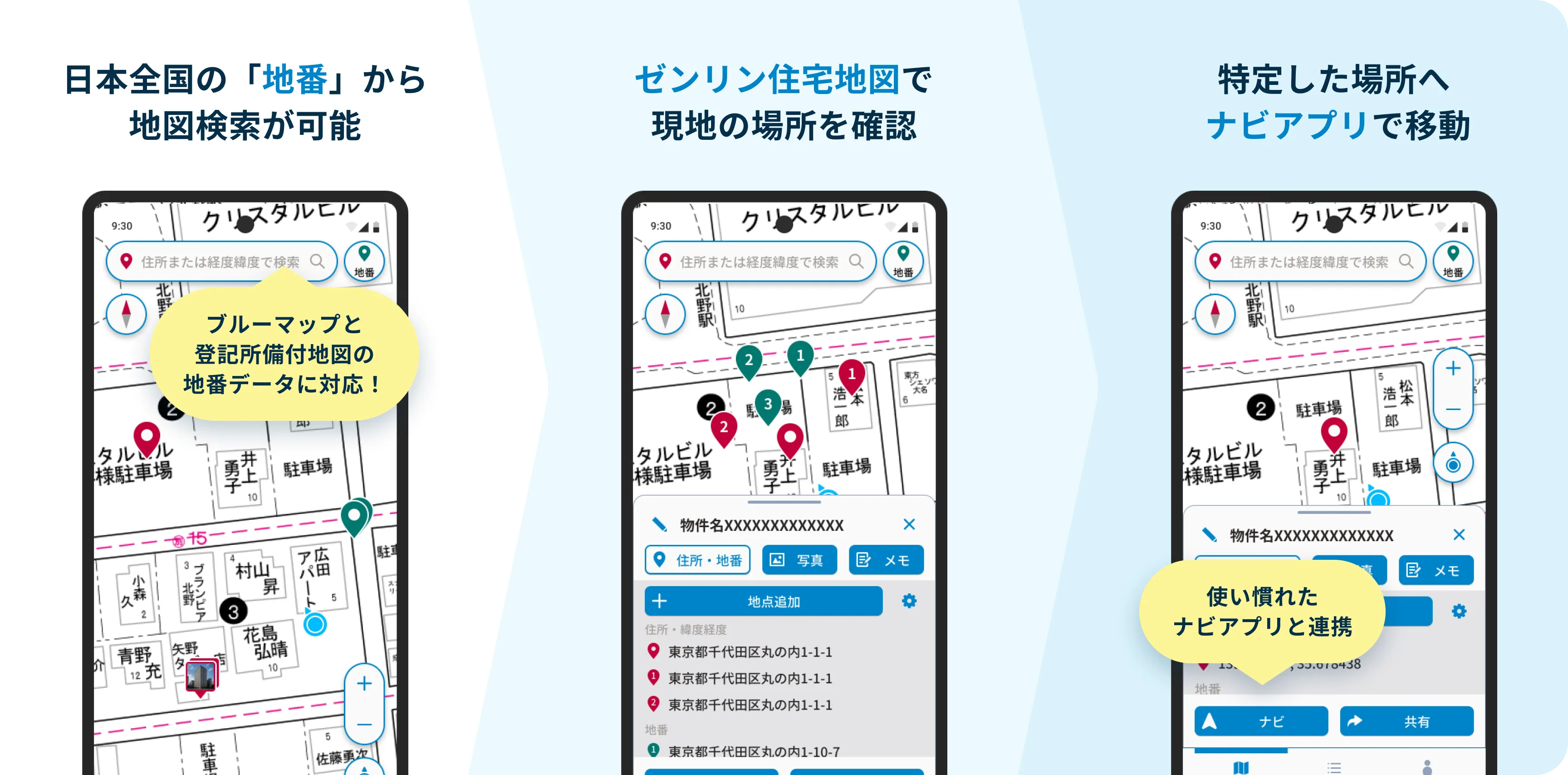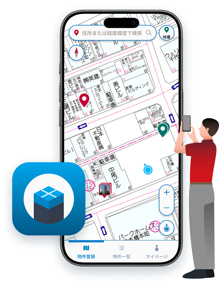 ゼンリンのブルーマップと登記所備付地図の地番データに対応。住所では見つからない物件も、地番で正確に特定できます。