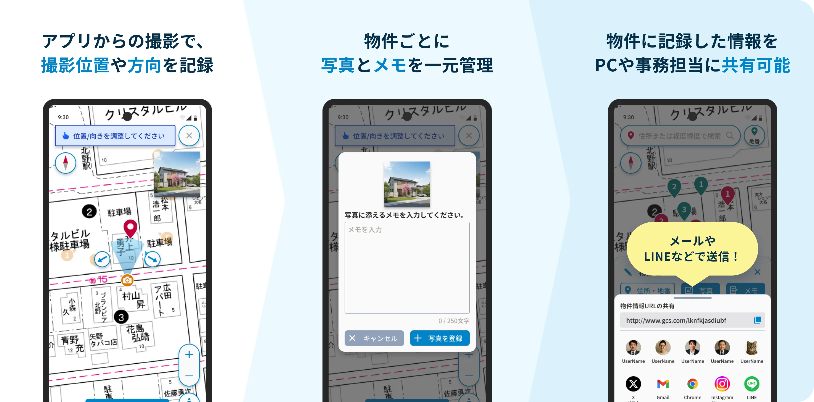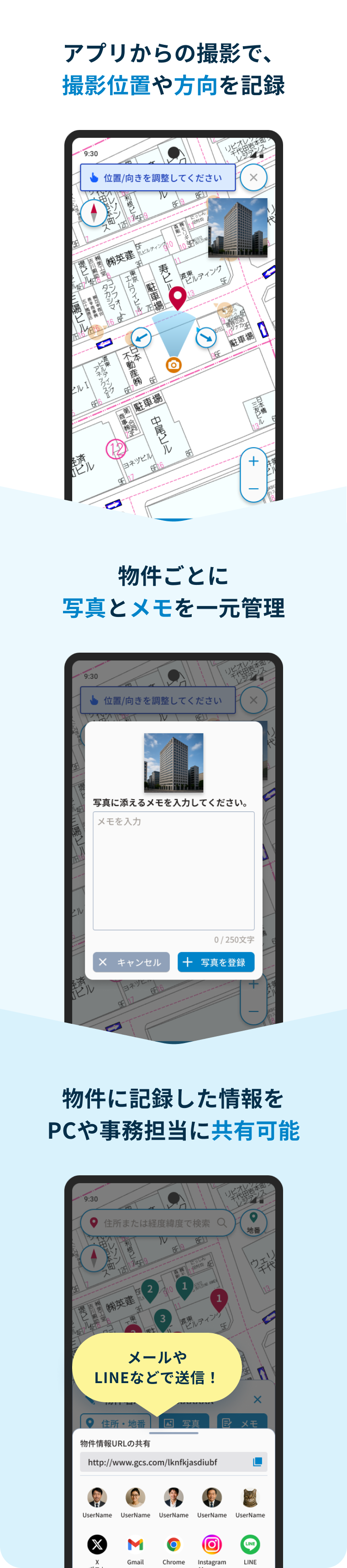 地番提供エリアはこちら撮影した写真は、位置情報と撮影方向を地図上に保存。どの場所で何を撮ったか一目瞭然で、写真整理の手間から解放されます。